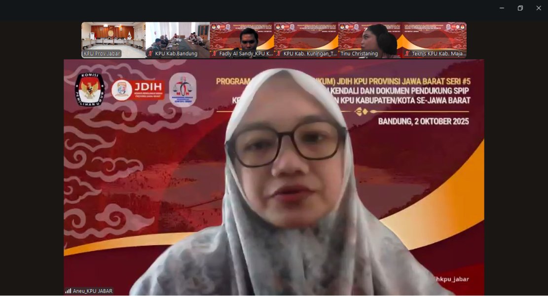 BANDUNG - KPU Provinsi Jawa Barat kembali melaksanakan Program MH (Membahas Hukum) JDIH KPU Provinsi Jawa Barat Seri #5 dengan tema Pelaporan Kartu Kendali dan Dokumen Pendukung SPIP, pada Kamis (2/10) secara daring.