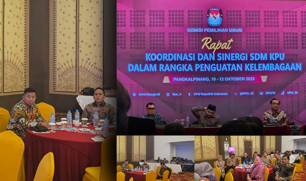 PANGKALPINANG - KPU Provinsi Jawa Barat menghadiri Rapat Koordinasi dan Sinergi SDM KPU dalam Rangka Penguatan Kelembagaan yang diselenggarakan Sekretariat Jenderal KPU RI pada 10–12 Oktober 2025 di Swissbell Hotel Pangkalpinang, Provinsi Kepulauan Bangka Belitung. Hadir Ketua Divisi SDM, Organisasi, Diklat, dan Litbang, Abdullah Sapi'i serta Kabag Parhumas dan SDM Yunike Puspita.