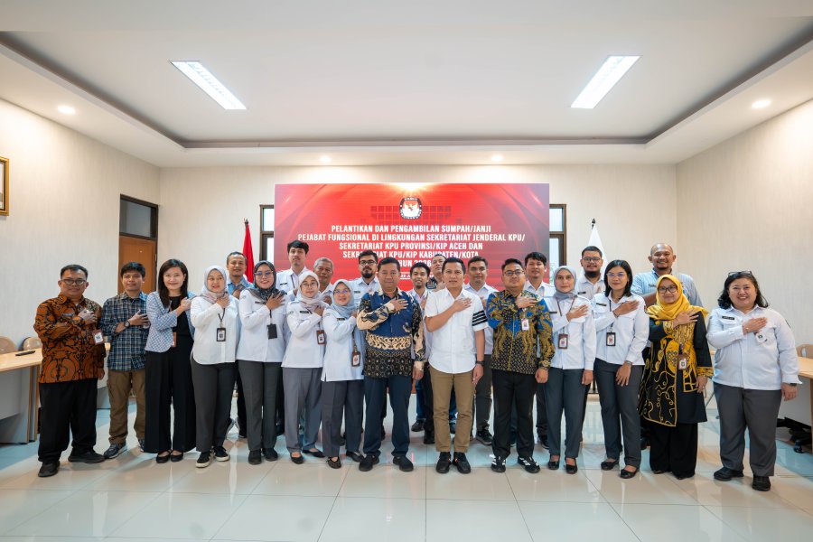 Prosesi pengambilan sumpah/janji pejabat dipimpin langsung oleh Sekretaris Jenderal KPU RI, Bernad Dermawan Sutrino, sementara Ketua KPU RI, Mochammad Afifuddin, menyampaikan arahan kepada seluruh pejabat fungsional yang dilantik.