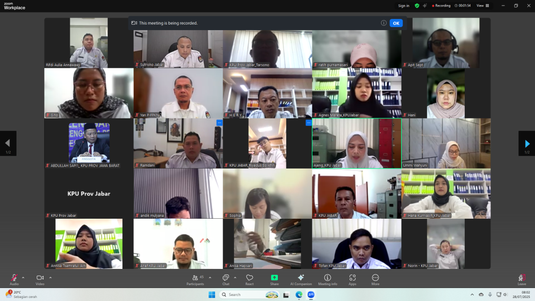 BANDUNG — Komisi Pemilihan Umum (KPU) Provinsi Jawa Barat menggelar apel pagi secara virtual pada Senin (28/07/2025) yang diikuti oleh seluruh jajaran sekretariat, mulai dari pejabat struktural, fungsional, kepala bagian, kepala subbagian, hingga staf di lingkungan KPU Provinsi Jawa Barat.