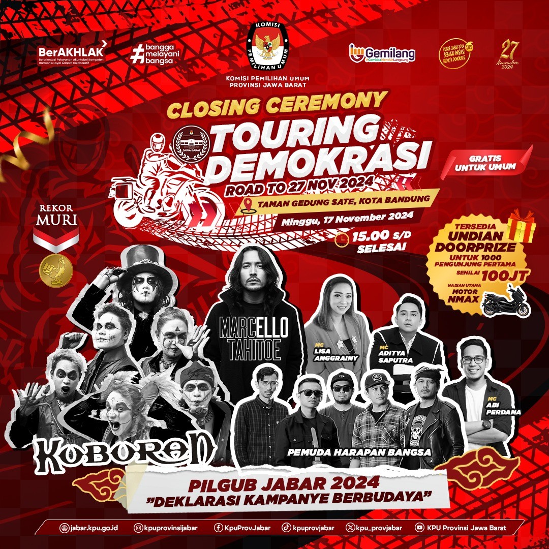 BANDUNG - Komisi Pemilihan Umum (KPU) Provinsi Jawa Barat akan menggelar Closing Ceremony Touring Demokrasi Road To 27 November 2024 yang akan digelar di Taman Gedung Sate, Kota Bandung pada Minggu (17/11/2024).