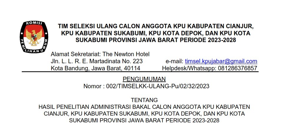 Berdasarkan Berita Acara Tim Seleksi Nomor 009/TIMSELKK-ULANG-BA/02/32/2023 tanggal 12 November 2023 tentang Penetapan Hasil Penelitian Administrasi Bakal Calon Anggota KPU Kabupaten Cianjur, KPU Kabupaten Sukabumi, KPU Kota Depok, dan KPU Kota Sukabumi Provinsi Jawa Barat Periode 2023-2028, Bakal Calon yang lulus Penelitian Administrasi dan berhak mengikuti Tahapan Seleksi berikutnya sebagai berikut :