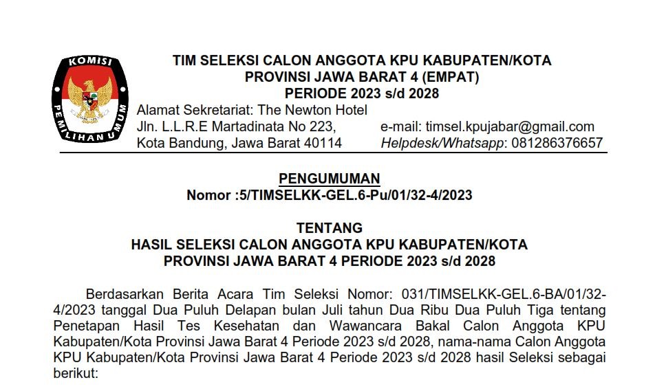 HASIL SELEKSI CALON ANGGOTA KPU KABUPATEN/KOTA PROVINSI JAWA BARAT 4 PERIODE 2023 s/d 2028