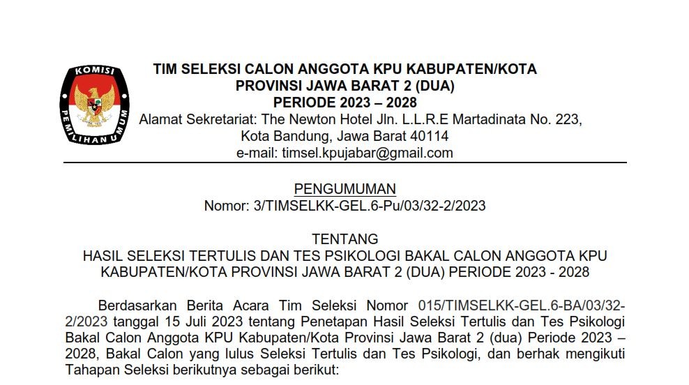 HASIL SELEKSI TERTULIS DAN TES PSIKOLOGI BAKAL CALON ANGGOTA KPU KABUPATEN/KOTA PROVINSI JAWA BARAT 2 (DUA) PERIODE 2023 - 2028