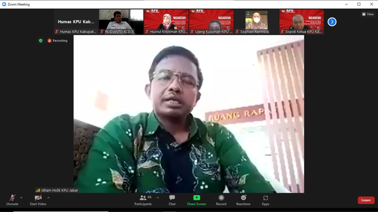 Kab. Cirebon, jabar.kpu.go.id – NgaDemi atau Ngaji Demokrasi dan Pemilu sebagai program webinar KPU Kabupaten Cirebon hadir membahas pendidikan demokrasi dan aktivasi organisasi intra sekolah sebagai ruang pendidikan demokrasi. Membicarakan demokrasi sebagai sistem yang digunakan Indonesia saat ini perlu dimaknai secara mendalam oleh setiap warga negara. Seperti yang diungkap Idham Holik dalam pengantar webinar, Rabu (16/3/22).