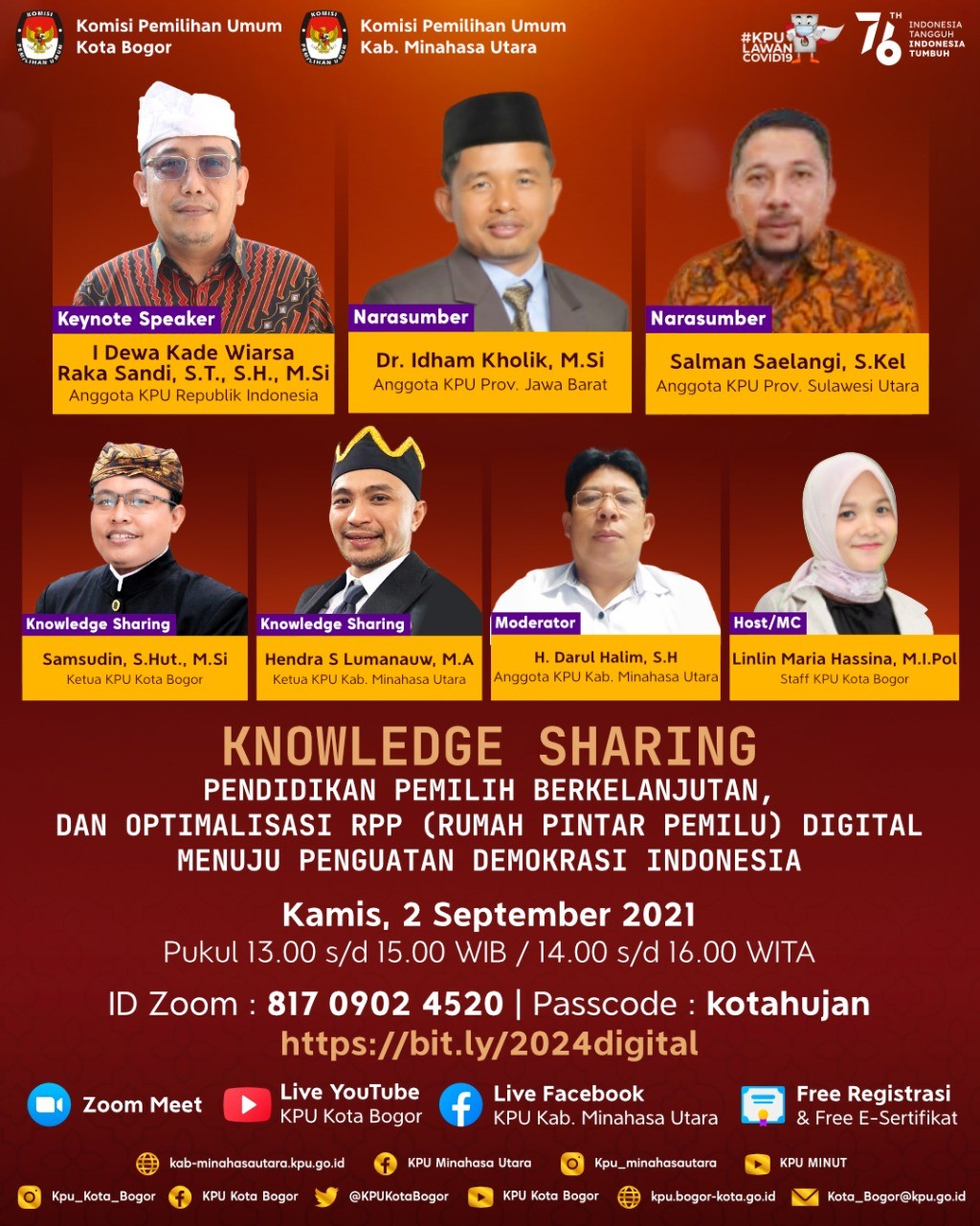 Bogor, jabar.kpu.go.id – Kehadiran Rumah Pintar Pemilu (RPP) menjadi bagian penting bagi lembaga Komisi Pemilihan Umum (KPU). Pasalnya, RPP bisa menjadi sarana edukasi bagi pemilih untuk peningkatan partisipasi masyarakat dalam setiap penyelenggaraan pemilihan. Hal tersebut terungkap dalam sharing knowledge antara KPU Kota Bogor dengan KPU Kabupaten Minahasa Utara bertajuk pendidikan pemilih berkelanjutan, dan optimalisasi RPP (Rumah Pintar Pemilu) digital menuju penguatan demokrasi Indonesia, Kamis (2/9/21).