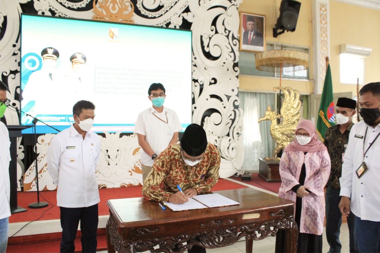 Bandung, kab-bandung.kpu.go.id – 8 September 2021 menjadi hari bersejarah bagi KPU Kabupaten Bandung setelah perjuangan panjang selama 10 tahun menanti hibah tanah serta gedung dan bangunan. Hal ini disampaikan oleh Ketua KPU Kabupaten Bandung, Agus Baroya, SP., MM. pada acara Penyerahan Naskah Perjanjian Hibah Daerah (NPHD) dan Penandatanganan Berita Acara Serah Terima (BAST) Hibah Tanah dan Gedung dari Pemerintah Daerah Kabupaten Bandung kepada KPU Kabupaten Bandung yang dilaksanakan di Rumah Dinas Bupati Bandung, Komp. Pemda, Jl. Raya Soreang KM 17.
