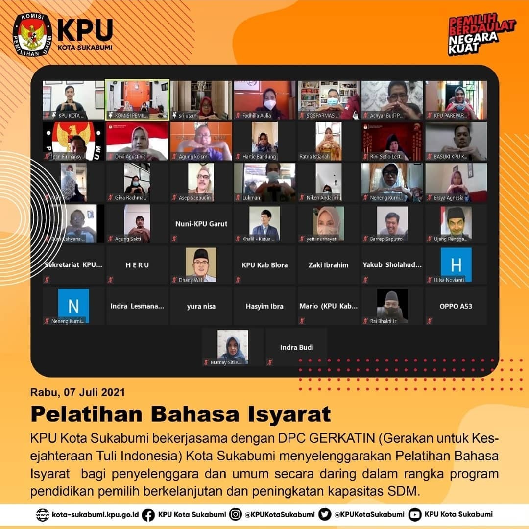 Kegiatan daring tentang pelatihan bahasa isyarat berlangsung lancer dan menarik. Kegiatan tersebut juga menghadirkan Ketua KPU Kota Sukabumi, Sri Utami, Ketua Bisindo Sukabumi, Santi Eka Permana, dan Ketua Gerkatin Sukabumi, Khalil Ibrahim. (KPU Jabar : Siho/ed.Dien)