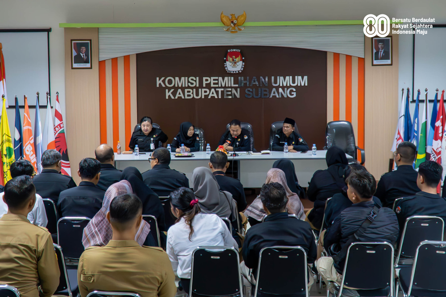 SUBANG — Dalam upaya memperkuat sinergi kerja di lingkungan Komisi Pemilihan Umum (KPU), Sekretaris KPU Provinsi Jawa Barat, Eko Iswantoro, bersama Kepala Bagian Partisipasi Masyarakat dan SDM, Yunike Puspita serta Kepala Sub Bagian SDM Norhina Kurniawaty melakukan kunjungan kerja ke Sekretariat KPU Kabupaten Subang pada Rabu (20/8/2025). Kegiatan berlangsung di Aula KPU dan dihadiri oleh seluruh jajaran pegawai KPU Kabuapten Subang.