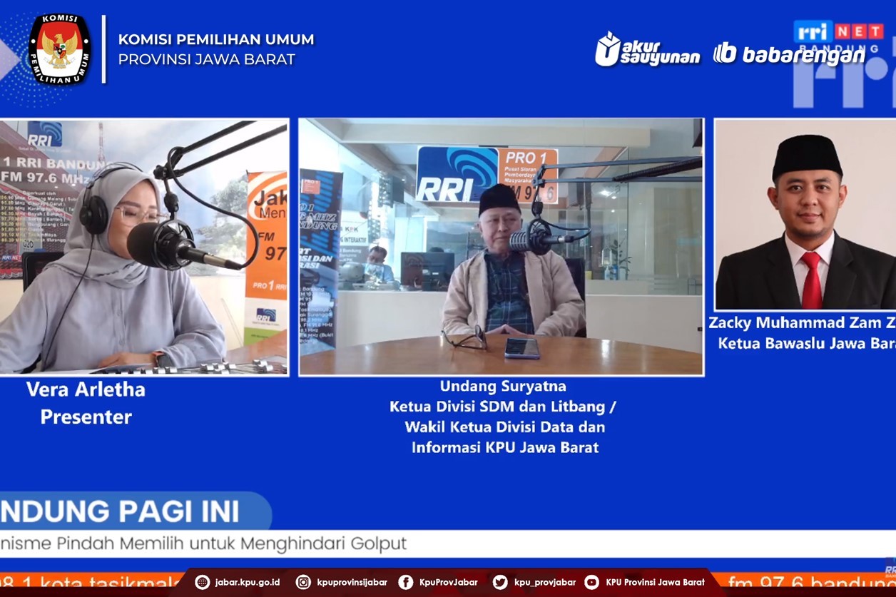 Bandung, jabar.kpu.go.id – Demi menjaga hak pilih Masyarakat di Jawa Barat, Anggota KPU Provinsi Jawa Barat Divisi Sumber Daya Manusia, Penelitian, dan Pengembangan yakni Undang Suryatna menjelaskan mekanisme pindah memilih. Dalam sebuah acara Bandung Pagi Ini yang disiarkan langsung oleh RRI Bandung dan tayang juga pada kanal Youtube-nya, Rabu (13/9/23).