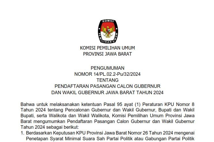 Pengumuman Nomor 14/PL.02.2-Pu/32/2024 tentang Pendaftaran Pasangan Calon Gubernur dan Wakil Gubernur Jawa Barat Tahun 2024.