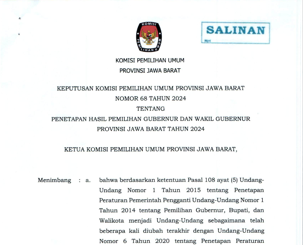 Berdasarkan Keputusan Komisi Pemilihan Umum Provinsi Jawa Barat Nomor 68 Tahun 2024 tentang Penetapan Hasil Pemilihan Gubernur dan Wakil Gubernur Provinsi Jawa Barat Tahun 2024, KPU Provinsi Jawa Barat Memutuskan dan Menetapkan Hasil Pemilihan Gubernur dan Wakil Gubernur Provinsi Jawa Barat Tahun 2024 berdasarkan hasil rapat pleno rekapitulasi penghitungan perolehan suara yang tertuang dalam formulir MODEL D.HASIL PROV-KWK-GUBERNUR.