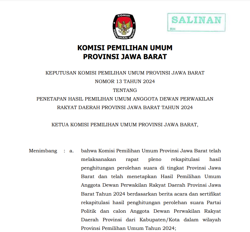 PENETAPAN HASIL PEMILIHAN UMUM ANGGOTA DEWAN PERWAKILAN RAKYAT DAERAH PROVINSI JAWA BARAT TAHUN 2024