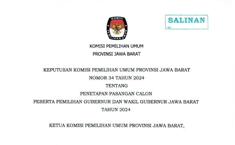 Keputusan Komisi Pemilihan Umum Provinsi Jawa Barat Nomor 34 Tahun 2024 Tentang Penetapan Pasangan Calon Peserta Pemilihan Gubernur dan Wakil Gubernur Jawa Barat Tahun 2024
