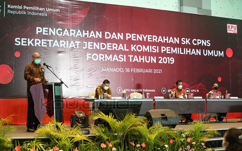 KPU RI menyerahkan SK CPNS Formasi Tahun 2019. Sebanyak 714 orang CPNS yang tersebar di seluruh Indonesia melaksanakan konferensi online untuk mengikuti kegiatan tersebut. Sementara itu, kegiatan langsung diselanggarakan di KPU Provinsi Sulawesi Utara, dihadiri Plt. Ketua didampingi oleh Sekertaris serta jajaran KPU RI, dan Sekertaris KPU Provinsi seluruh Indonesia pada Kamis (18/02/2021).
