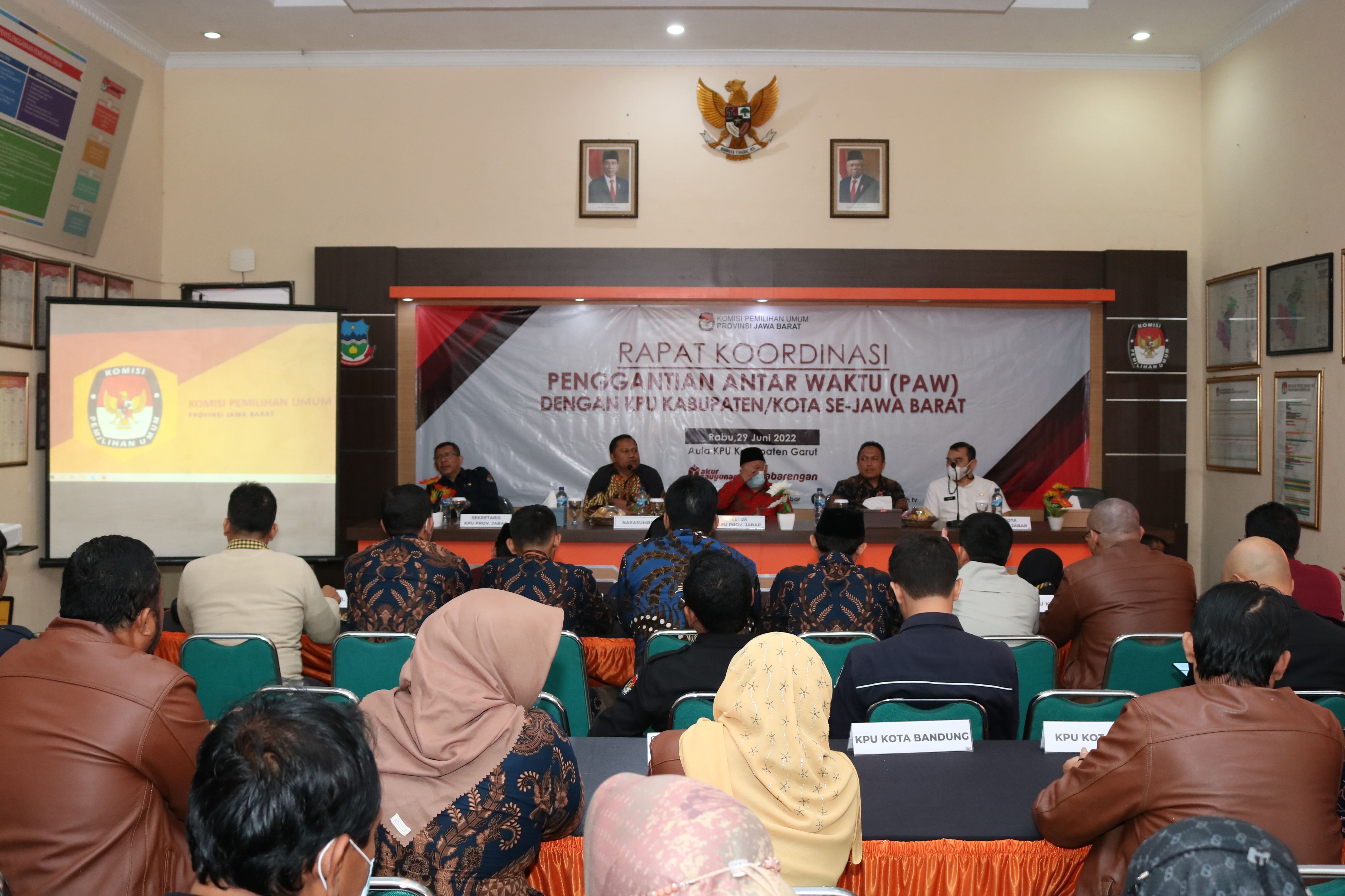 Bandung, jabar.kpu.go.id – KPU Provinsi Jawa Barat melalui Divisi Teknis Penyelenggaraan Pemilu gelar rapat koordinasi Penggantian Antar Waktu (PAW) bersama KPU Kabupaten/Kota se-Jawa Barat. Penggantian Antar Waktu (PAW) memerlukan koordinasi dengan Pemerintahan Daerah, DPRD setempat, dan Partai Politik. Seperti itu gambaran yang dijelaskan Plh Ketua KPU Provinsi Jawa Barat, Undang Suryatna dalam rakor yang digelar di Aula KPU Kabupaten Garut, Kamis (29/6/22).