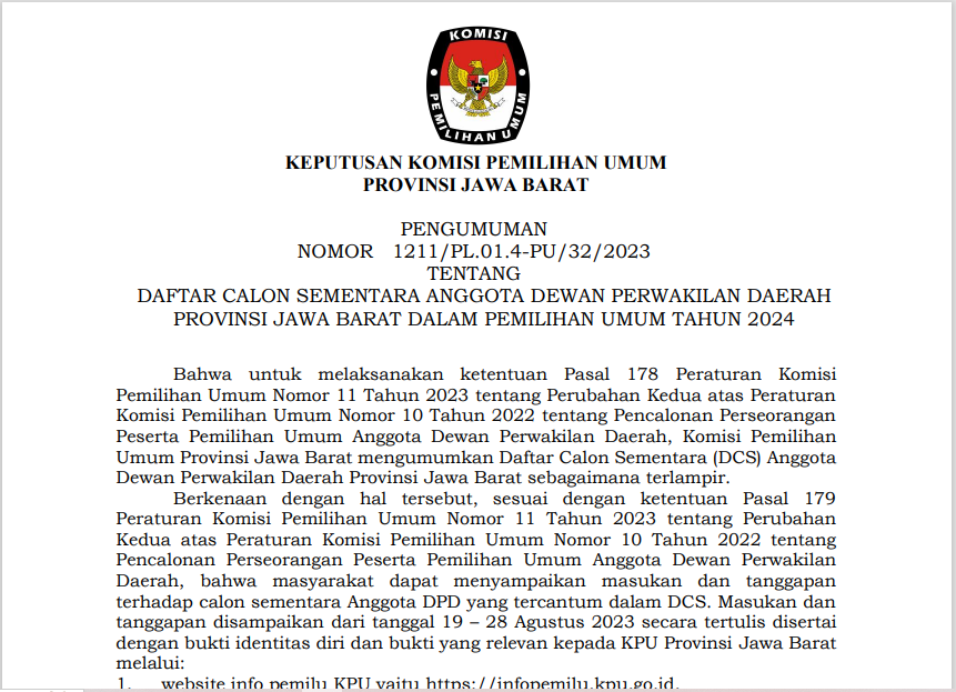 PENGUMUMAN DAFTAR CALON SEMENTARA ANGGOTA DEWAN PERWAKILAN DAERAH PROVINSI JAWA BARAT DALAM PEMILIHAN UMUM TAHUN 2024