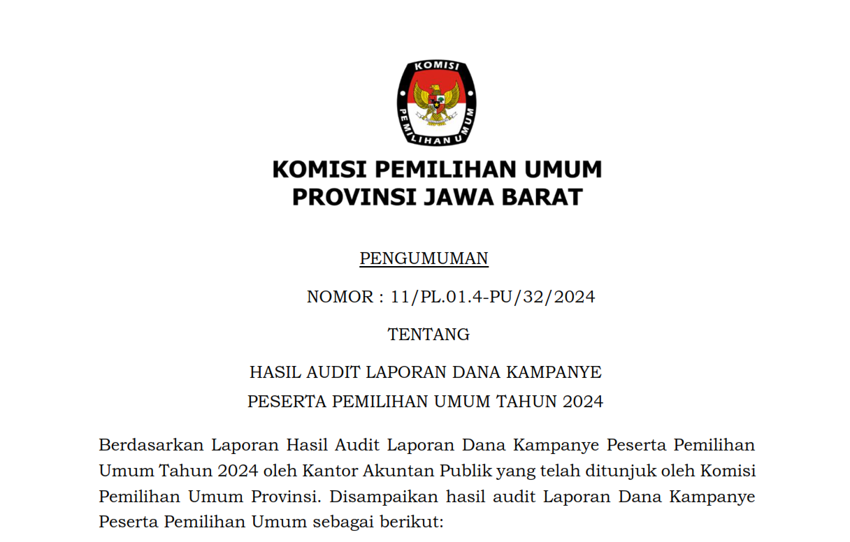 PENGUMUMAN HASIL AUDIT LAPORAN DANA KAMPANYE PESERTA PEMILIHAN UMUM TAHUN 2024 DI PROVINSI JAWA BARAT