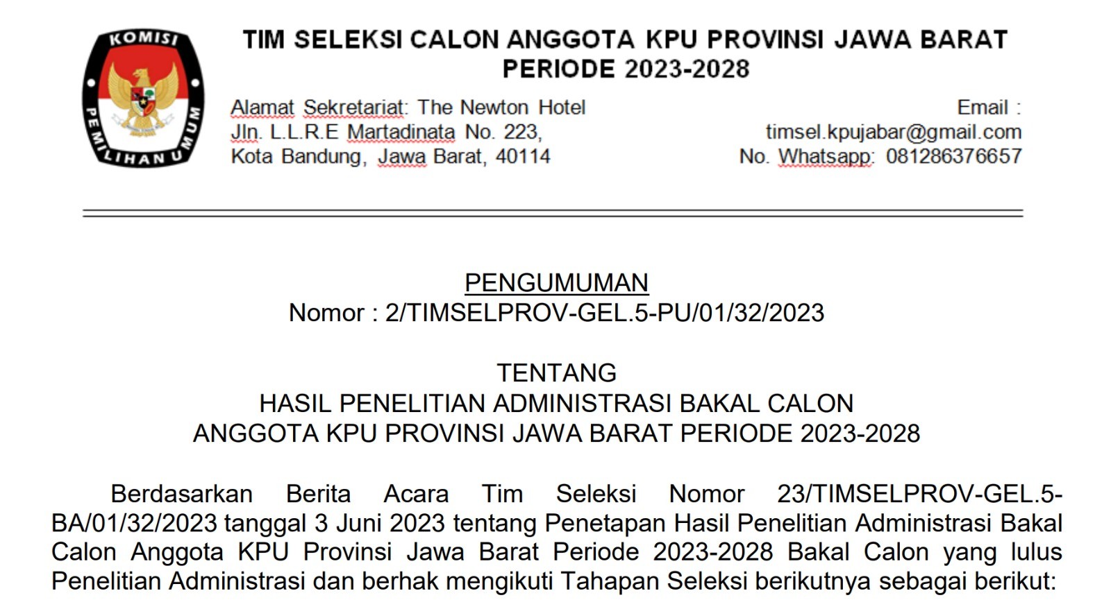 PENGUMUMAN HASIL PENELITIAN ADMINISTRASI BAKAL CALON ANGGOTA KPU PROVINSI JAWA BARAT PERIODE 2023-2028