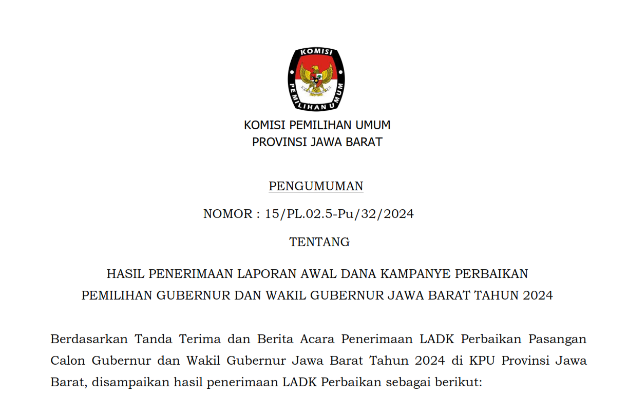 PENGUMUMAN HASIL PENERIMAAN LAPORAN AWAL DANA KAMPANYE PERBAIKAN PEMILIHAN GUBERNUR DAN WAKIL GUBERNUR JAWA BARAT TAHUN 2024