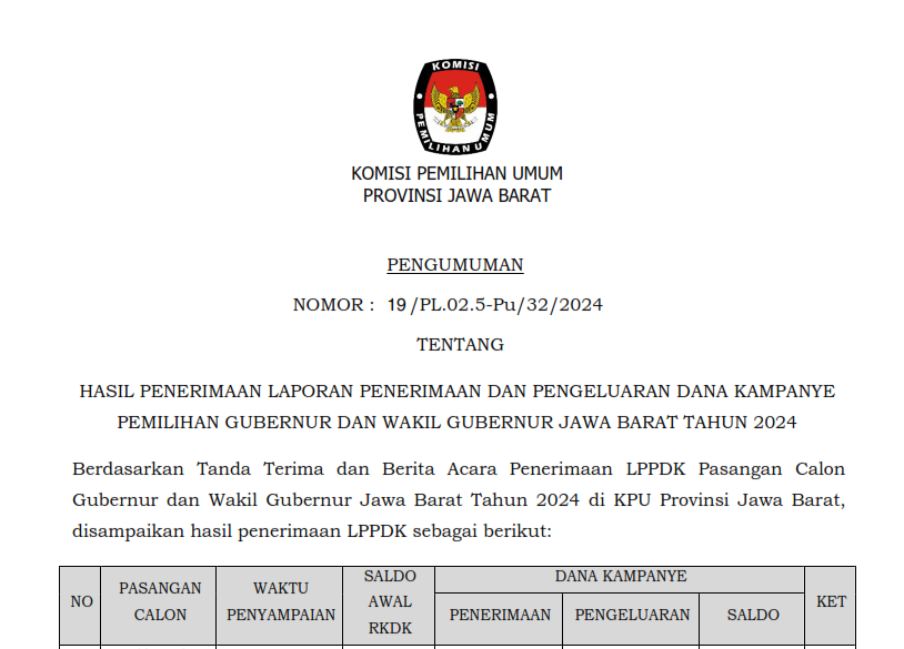 PENGUMUMAN HASIL PENERIMAAN LAPORAN PENERIMAAN DAN PENGELUARAN DANA KAMPANYE PEMILIHAN GUBERNUR DAN WAKIL GUBERNUR JAWA BARAT TAHUN 2024