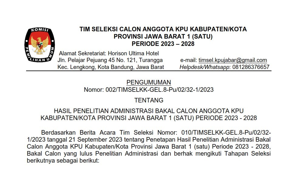 Berdasarkan Berita Acara Tim Seleksi Nomor: 010/TIMSELKK-GEL.8-Pu/02/32- 1/2023 tanggal 21 September 2023 tentang Penetapan Hasil Penelitian Administrasi Bakal Calon Anggota KPU Kabupaten/Kota Provinsi Jawa Barat 1 (satu) Periode 2023 - 2028, Bakal Calon yang lulus Penelitian Administrasi dan berhak mengikuti Tahapan Seleksi berikutnya sebagai berikut
