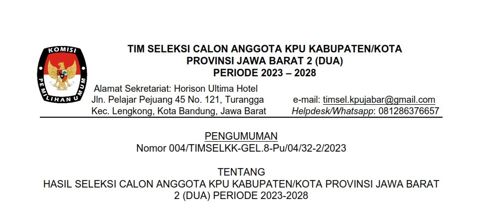 PENGUMUMAN HASIL SELEKSI CALON ANGGOTA KPU KABUPATEN/KOTA GELOMBANG 8 WILAYAH PROVINSI JAWA BARAT 2 (DUA)