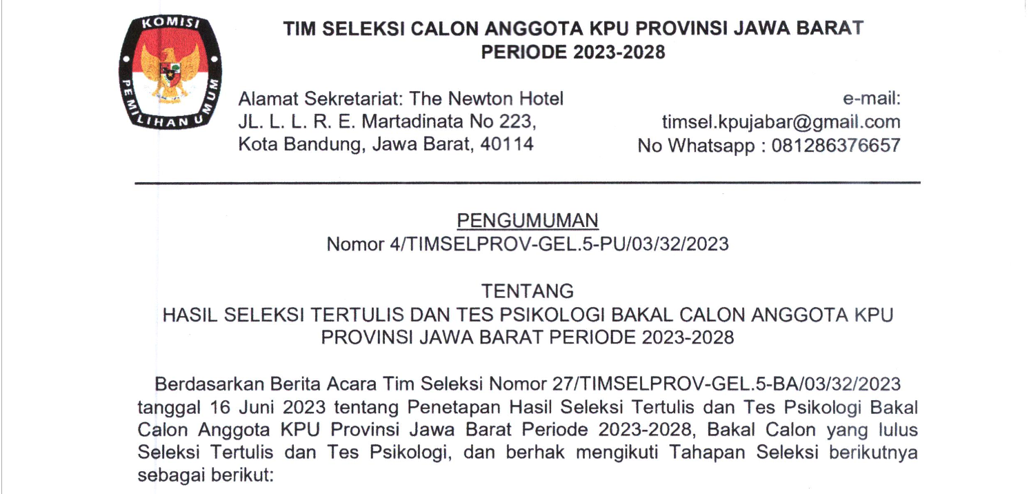 PENGUMUMAN HASIL SELEKSI TERTULIS DAN TES PSIKOLOGI BAKAL CALON ANGGOTA KPU PROVINSI JAWA BARAT PERIODE 2023-2028