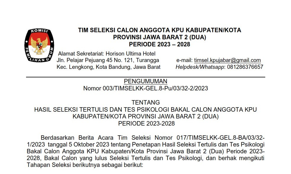 PENGUMUMAN HASIL SELEKSI TES TERTULIS DAN TES PSIKOLOGI CALON ANGGOTA KPU KABUPATEN/KOTA GELOMBANG 8 WILAYAH JAWA BARAT 2