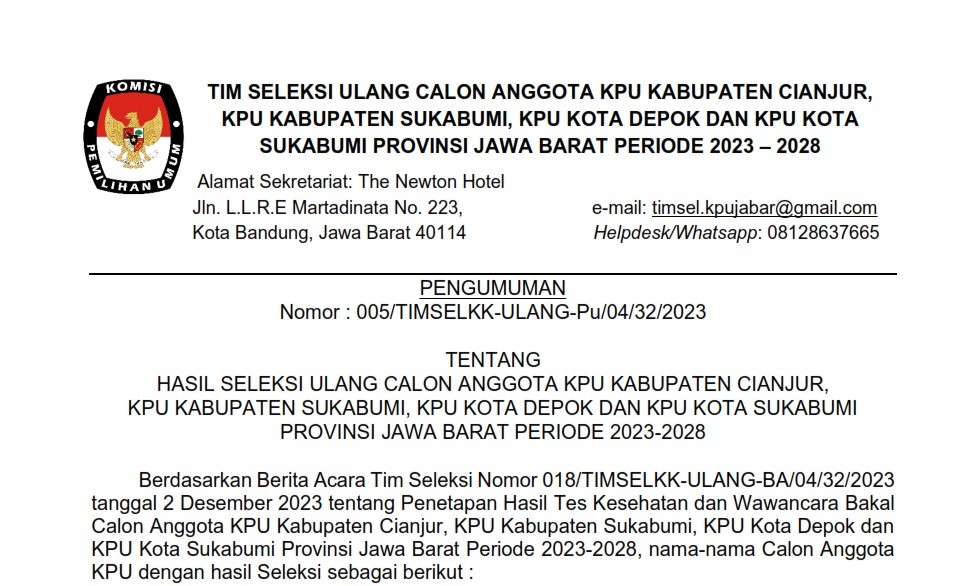 PENGUMUMAN HASIL SELEKSI ULANG CALON ANGGOTA KPU KABUPATEN CIANJUR, KPU KABUPATEN SUKABUMI, KPU KOTA DEPOK DAN KPU KOTA SUKABUMI PROVINSI JAWA BARAT PERIODE 2023-2028
