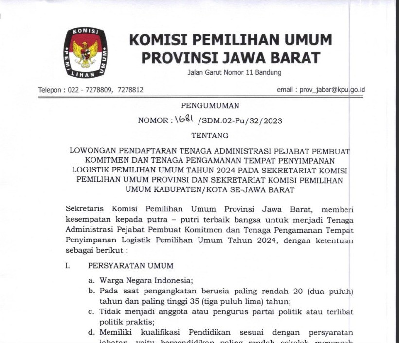Sekretaris Komisi Pemilihan Umum Provinsi Jawa Barat, memberi kesempatan kepada putra – putri terbaik bangsa untuk menjadi Tenaga Administrasi Pejabat Pembuat Komitmen dan Tenaga Pengamanan Tempat Penyimpanan Logistik Pemilihan Umum Tahun 2024