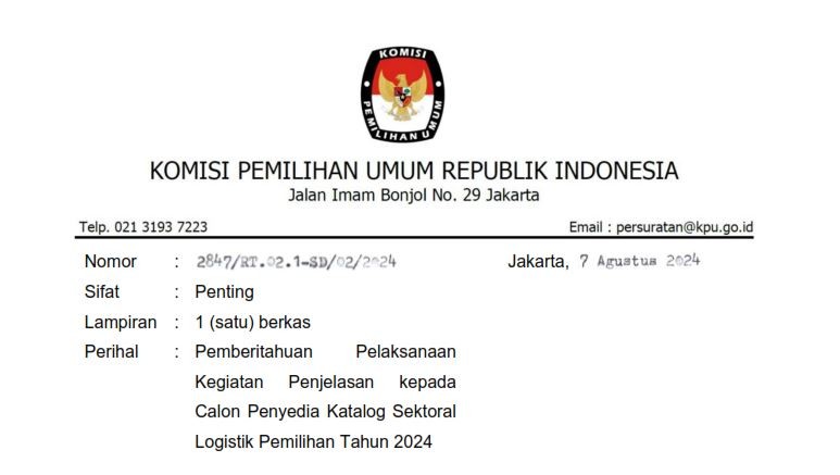 Dalam rangka Pengadaan Logistik Pemilihan Gubernur dan Wakil Gubernur, Bupati dan Wakil Bupati, serta Wali Kota dan Wakil Wali Kota Tahun 2024, KPU Mengundang para pelaku usaha dalam acara penjelasan kepada calon Penyedia Katalog Sektoral Logistik Pemilu Tahun 2024 yang akan dilaksanakan pada :