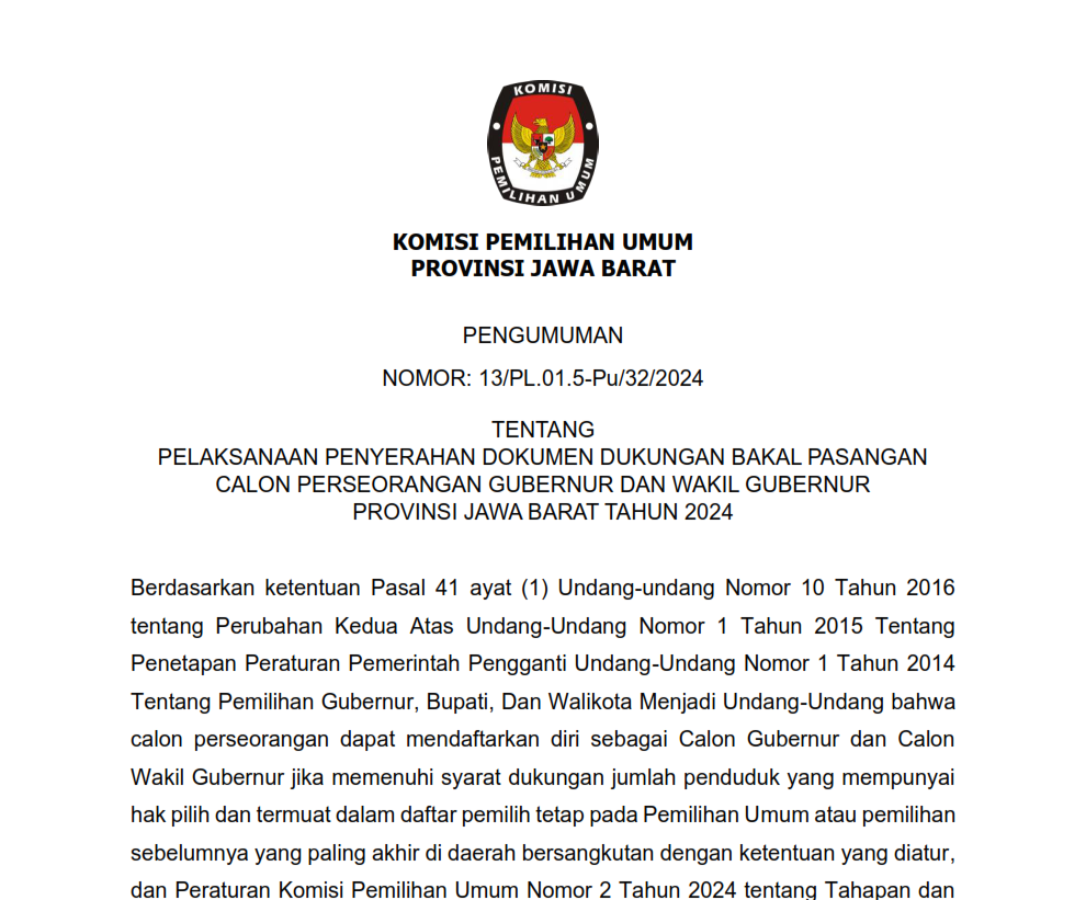PENGUMUMAN PELAKSANAAN PENYERAHAN DOKUMEN DUKUNGAN BAKAL PASANGAN CALON PERSEORANGAN GUBERNUR DAN WAKIL GUBERNUR PROVINSI JAWA BARAT TAHUN 2024