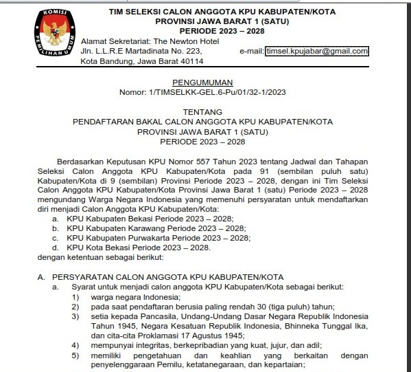 PENGUMUMAN PENDAFTARAN BAKAL CALON ANGGOTA KPU KABUPATEN/KOTA PROVINSI JAWA BARAT 1 (SATU) PERIODE 2023 – 2028