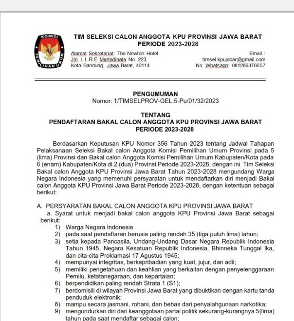 PENGUMUMAN PENDAFTARAN BAKAL CALON ANGGOTA KPU PROVINSI JAWA BARAT PERIODE 2023-2028