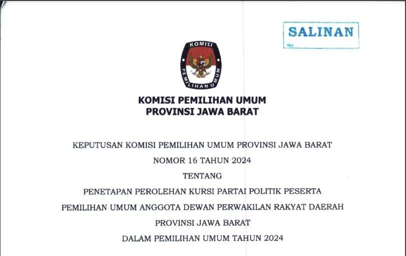 Berikut kami sampaikan Keputusan Komisi Pemilihan Umum Provinsi Jawa Barat Nomor 16 Tahun 2024 tentang Penetapan Perolehan Kursi Partai Politik Peserta Pemilihan Umum Anggota Dewan Perwakilan Rakyat Daerah Provinsi Jawa Barat dalam Pemilihan Umum Tahun 2024, dan Keputusan Komisi Pemilihan Umum Provinsi Jawa Barat Nomor 17 Tahun 2024 tentang Penetapan Calon Terpilih Anggota Dewan Perwakilan Rakyat Daerah Provinsi Jawa Barat dalam Pemilihan Umum Tahun 2024 serta Keputusan Komisi Pemilihan Umum Provinsi Jawa Barat Nomor 18 Tahun 2024 tentang Perubahan atas Keputusan Komisi Pemilihan Umum Provinsi Jawa Barat Nomor 17 Tahun 2024 tentang Penetapan Calon Terpilih Anggota Dewan Perwakilan Rakyat Daerah Provinsi Jawa Barat dalam Pemilihan Umum Tahun 2024.