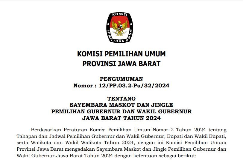 Berdasarkan Peraturan Komisi Pemilihan Umum Nomor 2 Tahun 2024 tentang Tahapan dan Jadwal Pemilihan Gubernur dan Wakil Gubernur, Bupati dan Wakil Bupati, serta Walikota dan Wakil Walikota Tahun 2024, dengan ini Komisi Pemilihan Umum Provinsi Jawa Barat mengadakan Sayembara Maskot dan Jingle Pemilihan Gubernur dan Wakil Gubernur Jawa Barat Tahun 2024 dengan ketentuan sebagai berikut: