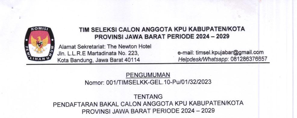 PENGUMUMAN TENTANG PENDAFTARAN BAKAL CALON ANGGOTA KPU KABUPATEN/KOTA PROVINSI JAWA BARAT PERIODE 2024 - 2029