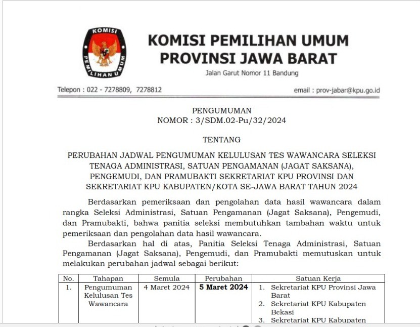 Berdasarkan hal di atas, Panitia Seleksi Tenaga Administrasi, Satuan Pengamanan (Jagat Saksana), Pengemudi, dan Pramubakti memutuskan untuk melakukan perubahan jadwal sebagai berikut: