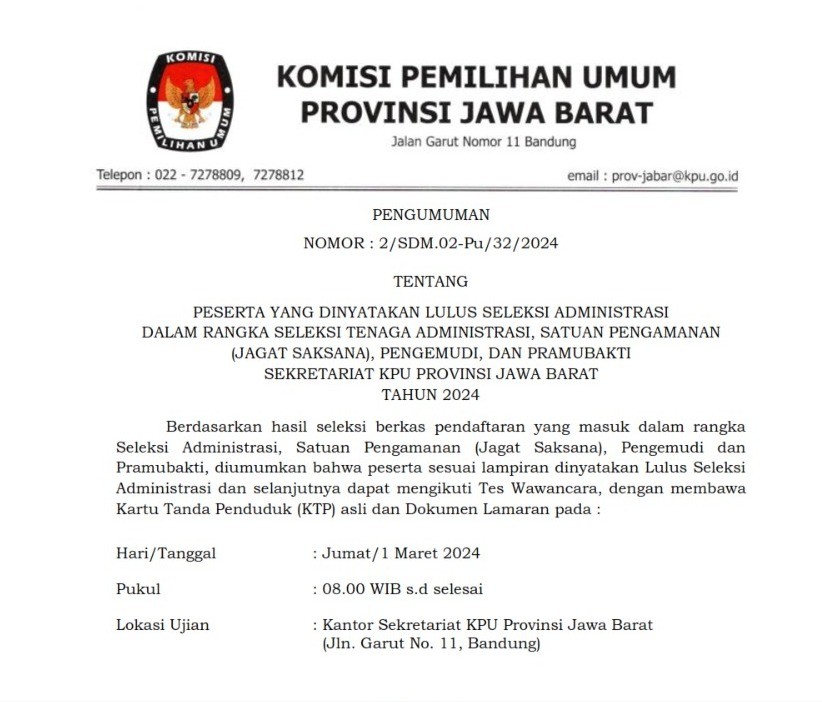 Berdasarkan hasil seleksi berkas pendaftaran yang masuk dalam rangka Seleksi Administrasi, Satuan Pengamanan (Jagat Saksana), Pengemudi dan Pramubakti, diumumkan bahwa peserta sesuai lampiran dinyatakan Lulus Seleksi Administrasi dan selanjutnya dapat mengikuti Tes Wawancara, dengan membawa Kartu Tanda Penduduk (KTP) asli dan Dokumen Lamaran pada: