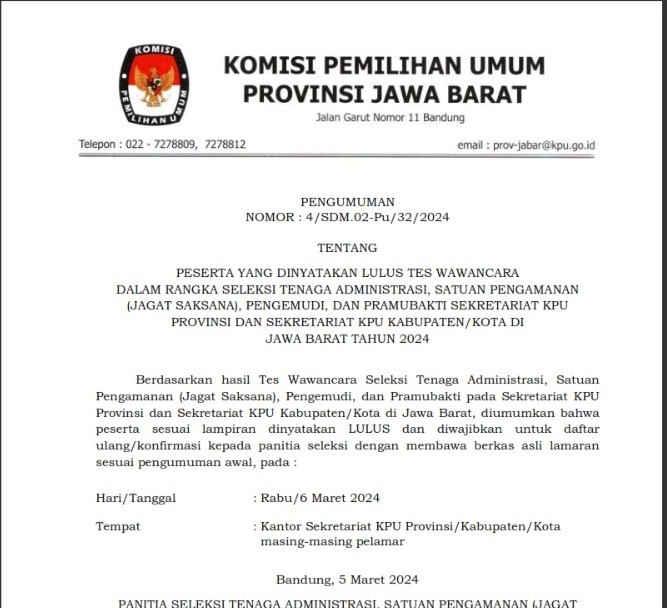 Berdasarkan hasil Tes Wawancara Seleksi Tenaga Administrasi, Satuan Pengamanan (Jagat Saksana), Pengemudi, dan Pramubakti pada Sekretariat KPU Provinsi dan Sekretariat KPU Kabupaten/Kota di Jawa Barat, diumumkan bahwa peserta sesuai lampiran dinyatakan LULUS dan diwajibkan untuk daftar ulang/konfirmasi kepada panitia seleksi dengan membawa berkas asli lamaran sesuai pengumuman awal, pada :