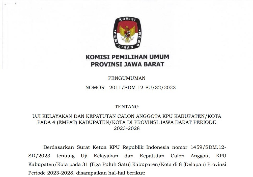 PENGUMUMAN UJI KELAYAKAN DAN KEPATUTAN CALON ANGGOTA KPU KABUPATEN/KOTA PADA 4 (EMPAT) KABUPATEN/KOTA DI PROVINSI JAWA BARAT PERIODE 2023-2028