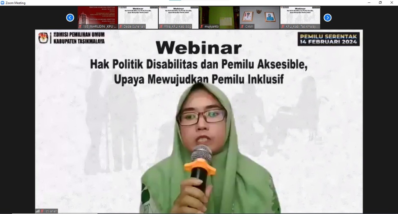 Kab. Tasikmalaya, jabar.kpu.go.id – Partisipasi pemilih disabilitas sangat penting dalam pemilu dan pemilihan. Namun, data KPU mencatat partisipasi pemilih disabilitas masih rendah. Pada pemilu presiden tahun 2019 rata-rata pemilih disabilitas mencapai 37.21%. Tantangan bagi KPU sebagai lembaga penyelenggara pemilu untuk meningkatkan pemilih disabilitas dalam pemilu maupun pemilihan harus dimulai dari membuka lebar peluang merealisasikan hak politik. Di ungkap Idham Holik pada webinar yang diselenggarakan KPU Kabupaten Tasikmalaya bahwa hak aksesibilitas pemilih disabilitas dijamin dalam Undang-Undang Nomor 8 Tahun 2016, Jumat (18/3/22).