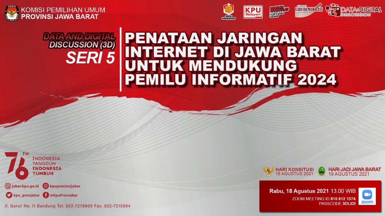 Bandung, jabar.kpu.go.id – Menghadirkan moment spesial dalam rangka memperingati HUT RI ke-76, Hari Konstitusi dan Ulang Tahun Provinsi Jawa Barat ke – 76, KPU Provinsi Jawa Barat kembali menggelar webinar Data & Digital Discussion (3d) Seri 5 dengan tema “Penataan Jaringan Internet Di Jawa Barat Untuk Mendukung Pemilu Informatif”. Webinar yang dipandu oleh Ketua Divisi Data dan Informasi KPU Provinsi Jawa Barat, Titik Nurhayati, M.Hum, M.H ini menghadirkan narasumber staf ahli Kementrian Desa, Pembangunan Desa Tertinggal, Gubernur Jawa Barat, dan Anggota KPU Republik Indonesia, Rabu (18/8/21).