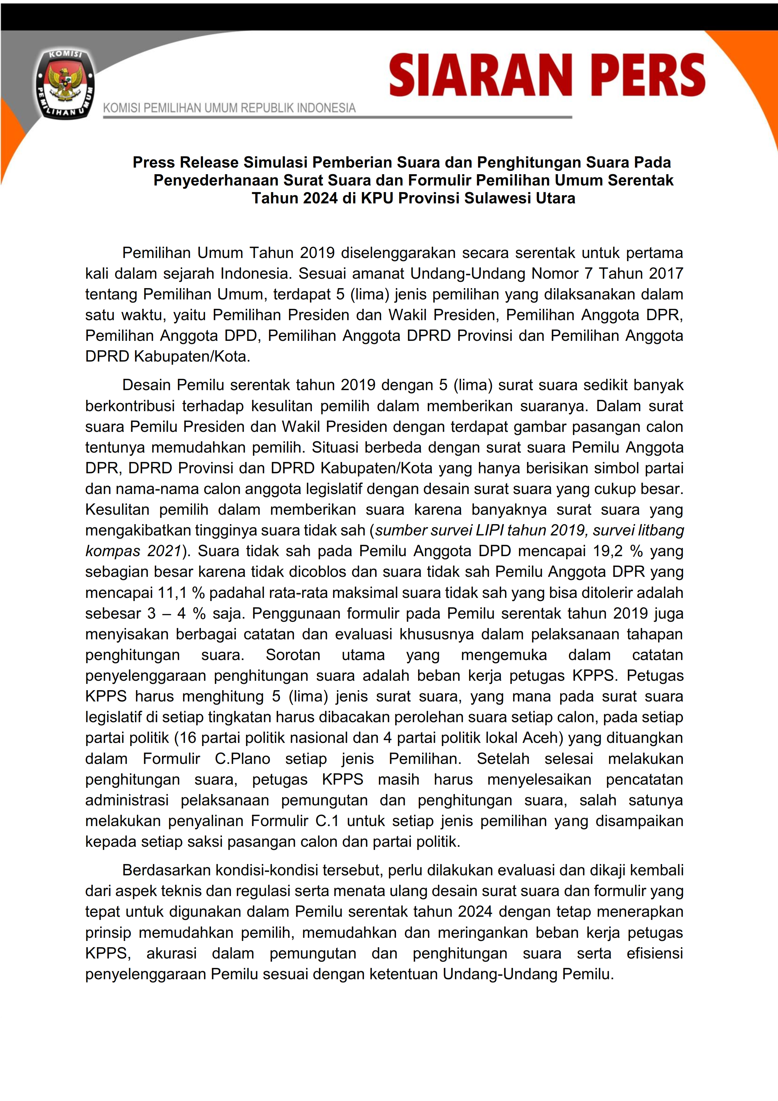 Press Release Simulasi Pemberian Suara dan Penghitungan Suara Pada Penyederhanaan Surat Suara dan Formulir Pemilihan Umum Serentak Tahun 2024 di KPU Provinsi Sulawesi Utara