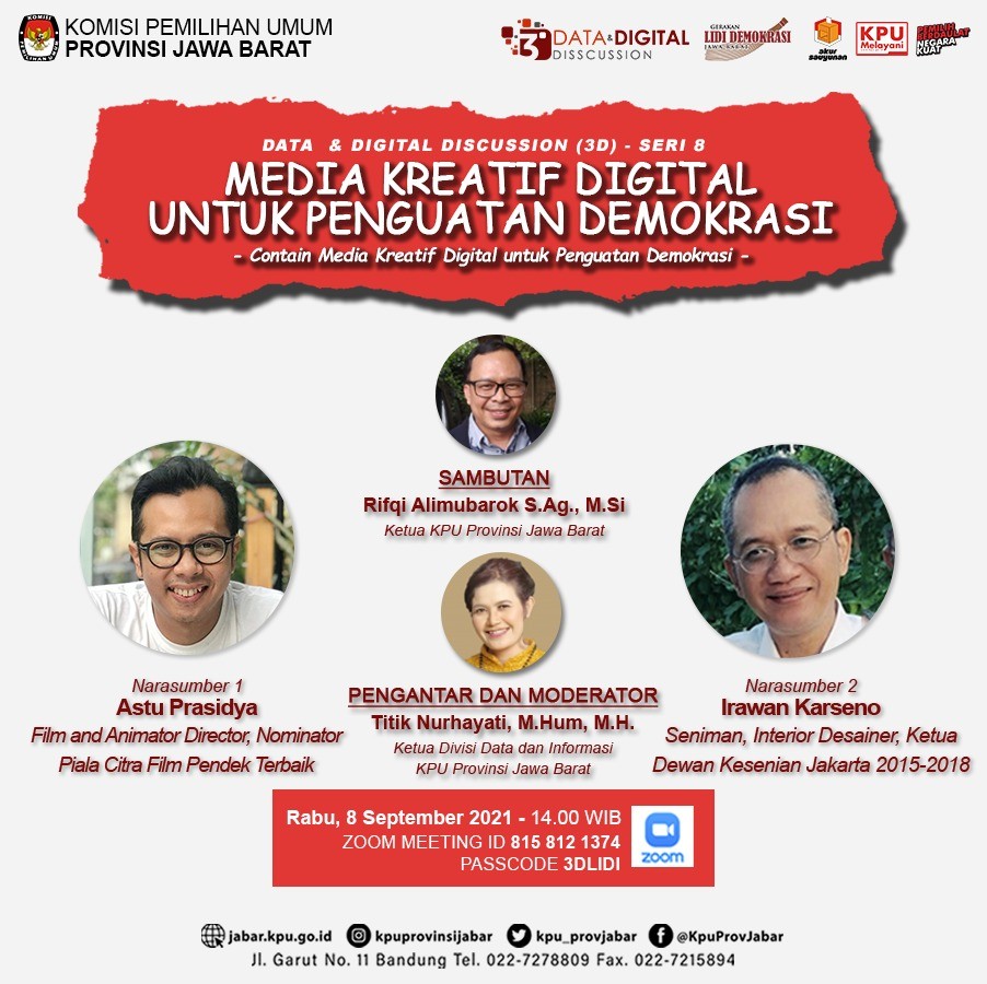 Program 3D ke-8 yang mengusung tema “Media Kreatif Digital Untuk Penguatan Demokrasi” menghadirkan narasumber dari Film Animator Director dan Nominator Piala Citra Film Pendek Terbaik, Astu Prasidya. Seniman, Interior Desain, Ketua Dewan Kesenian Jakarta 2015-2018, Irawan Karseno.