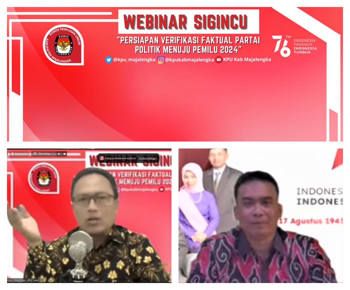 Majalengka, jabar.kpu.go.id – Komisi Pemilihan Umum (KPU) Kabupaten Majalengka kembali melaksanakan diskusi daring SIGINCU (Diskusi Garap Ide dan Narasi Cerdas) dengan menghadirkan narasumber Anggota KPU Provinsi Jawa Barat Divisi Teknis Penyelenggara dan Divisi Hukum dan Pengawasan yang dipandu oleh oleh Sarkan, Anggota KPU Kabupaten Majalengka Divisi Hukum dan Pengawasan diberi tema “Persiapan Verifikasi Faktual Partai Politik Menuju Pemilu Tahun 2024”. Webinar ini mengundang peserta dari berbagai lembaga seperti Kesbangpol Kabupaten Majalengka, Disdukcapil Kabupaten Majalengka, dan Partai Politik di Kabupaten Majalengka, serta diikuti oleh KPU Kabupaten/Kota di Jawa Barat maupun daerah lain di luar Provinsi Jawa Barat, Kamis (19/8/21).