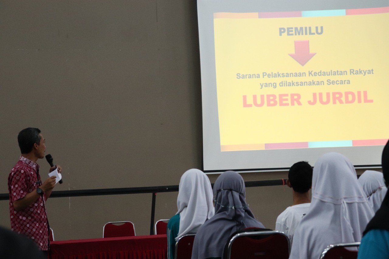 Sesi terakhir kegiatan sosialisasi ditutup dengan kuis interaktif mengenai materi kepemiluan dipandu oleh Guru SLBN A Citeureup, Andri Sugeng (Evan/Ed. Rtk/Dok. Revi)