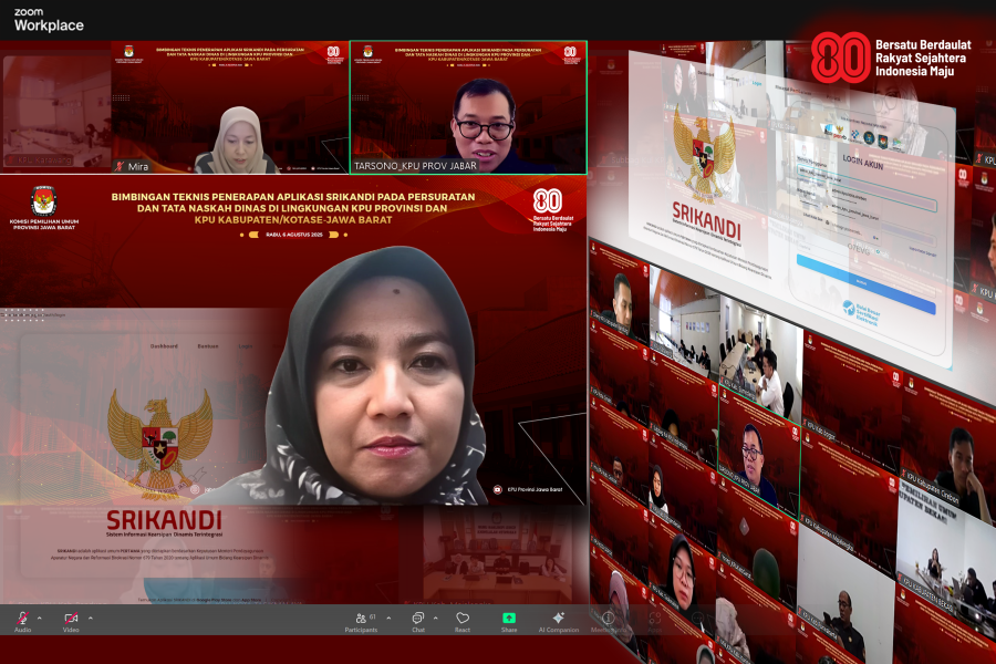 BANDUNG — Komisi Pemilihan Umum (KPU) Provinsi Jawa Barat mengikuti Bimbingan Teknis (Bimtek) Aplikasi Srikandi bersama Biro Umum KPU Republik Indonesia, Rabu (6/8/2025), secara daring melalui Zoom Meeting. Kegiatan ini diikuti oleh 27 KPU Kabupaten/Kota se-Jawa Barat sebagai bagian dari upaya penerapan Sistem Pemerintahan Berbasis Elektronik (SPBE).