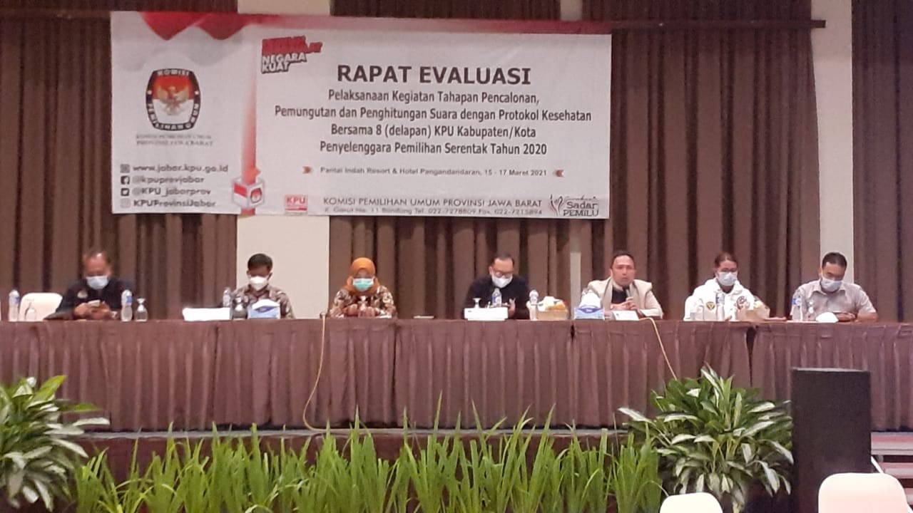Pangandaran, jabar.kpu.go.id - Terselenggaranya pemilihan serentak tahun 2020 dalam masa pandemi Covid-19 sebuah pencapaian bagi KPU di 8 (delapan) Kota dan Kabupaten sewilayah Jawa Barat. Sebab, tidak mudah melaksanakan tahapan pemilihan ditengah situasi yang memaksa masyarakat untuk tetap mematuhi protokol kesehatan dalam mencegah penyebaran virus Covid-19. Pencapaian tahapan pemilihan dinilai baik dan berhasil, namun perlu diketahui bahwa keberhasilan tahapan pemilihan tidak terlepas dari kendala saat pelaksanaan. Oleh karena itu, KPU Provinsi Jawa Barat menyelenggarakan rapat evaluasi pelaksanaan kegiatan tahapan pencalonan, pemungutan dan penghitungan suara dengan protokol kesehatan bersama 8 (delapan) KPU Kabupaten dan Kota penyelenggara pemilihan serentak tahun 2020 yang diselenggarakan pada 15 - 17 Maret 2021.